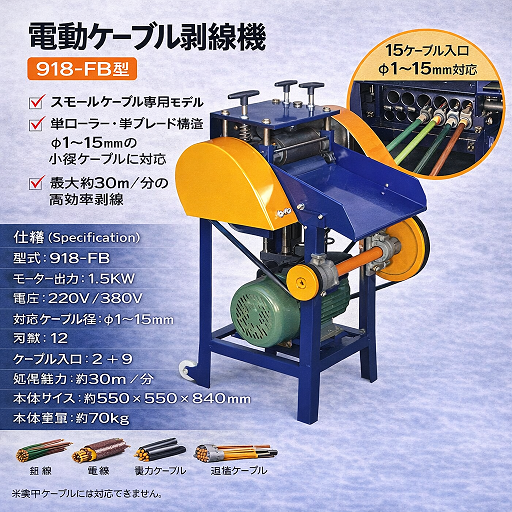 918-FB 電動ケーブル剥線機は、小径電線やケーブルの被覆を効率よく剥離するために設計された電動式ケーブルストリッピングマシンです。