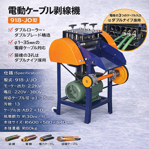 918-J / 918-JO 電動ケーブル剥線機は、電線やケーブルの被覆を効率的に剥離するために設計された高性能電動ケーブルストリッピングマシンです。