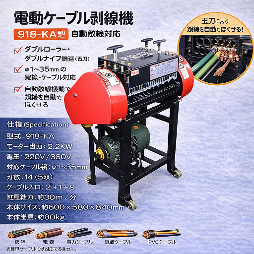 918-KA 電動ケーブル剥線機は、電線やケーブルの被覆を効率よく剥離するために設計された高性能電動ケーブルストリッピングマシンです。